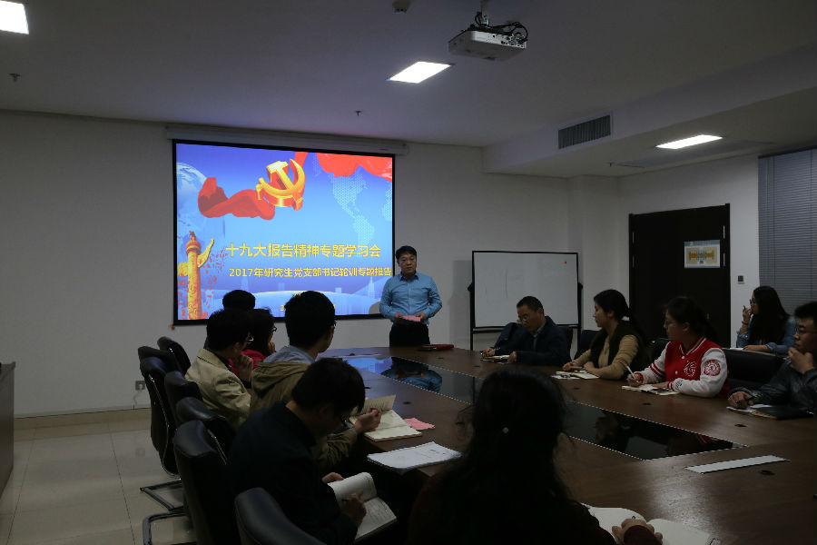 潘希德书记带领大家认真学习了习近平总书记代表十八届中央委员会向大会作的报告,并聚焦“新时代”、“新征程”、四个“伟大”、社会主要矛盾、两个重要时期、两个阶段等关键词,畅谈学习体会,直抒大好时代机遇,描述未来发展宏图。作为党支部书记轮训的第一讲,潘书记勉励在场的研究生党支部书记,牢记责任,为我国实现“两个一百年”目标而努力学习,奋发有为。在座的研究生党支书们也纷纷表示,在过去的五年里,确实感受到‘中国的速度’、‘中国的高度’,为祖国近五年取得的辉煌成就感到骄傲。