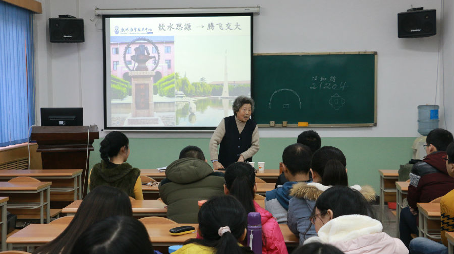 胡老师还为我们讲述了校徽、校歌、校训、校庆等所代表的交大精神以及它们的历史。胡老师说她眼中的“精勤求学,敦笃励志,果毅力行,忠恕任事”,每个短语的前两个字是教我们做人的道理,后两个字是教我们做事的准则。