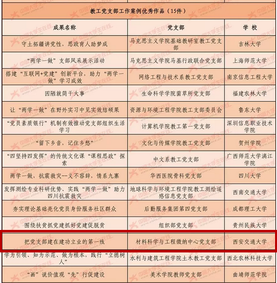 微纳中心党支部的成果作品“把党支部建在建功立业的第一线”荣获教工党支部工作案例优秀作品。本次活动共有788所高校、2352个党支部参与,2602件作品参赛。