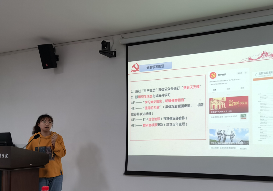 吴文媛从组织生活的主要容和形式入手,结合院办与实验室党支部工作的实例进行了分享和交流;宁晓辉在分享中强调了以问题为导向的工作思路,通过组织纪律、安全检查、制度建设等措施加强支部的建设;孙雅薇介绍了支部举办的清明祭奠英烈、结对交流等特色活动,增强支部党员的凝聚力;王志英从组织生活、“四史”学习、志愿活动三个方面介绍了支部开展的系列活动,并分享了支部本年度党史教育学习的规划。