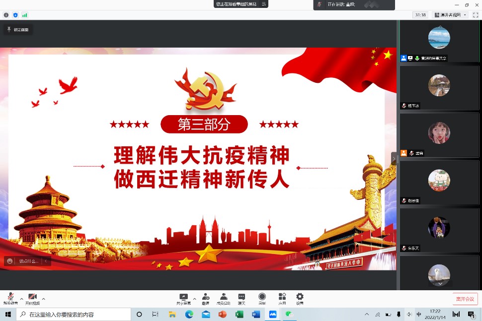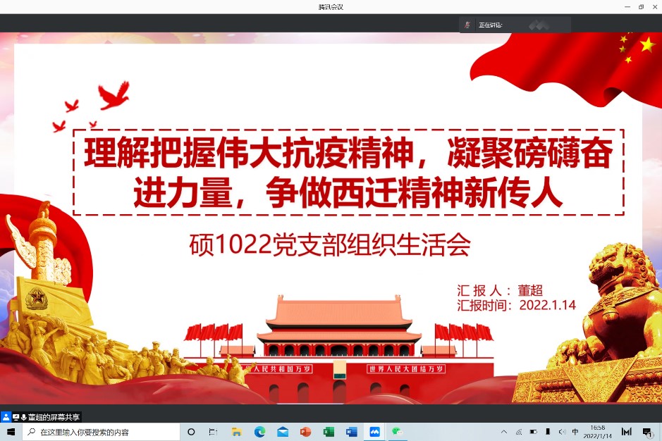 硕1022党支部开展“理解把握伟大抗疫精神,凝聚磅礴奋进力量,争做西迁精神新传人”专题组织生活会议