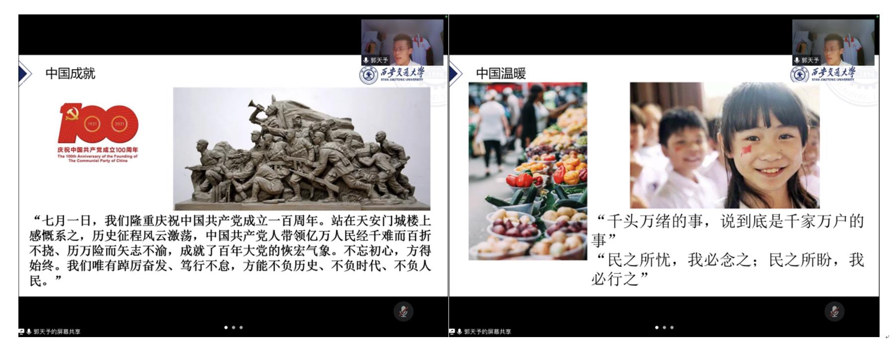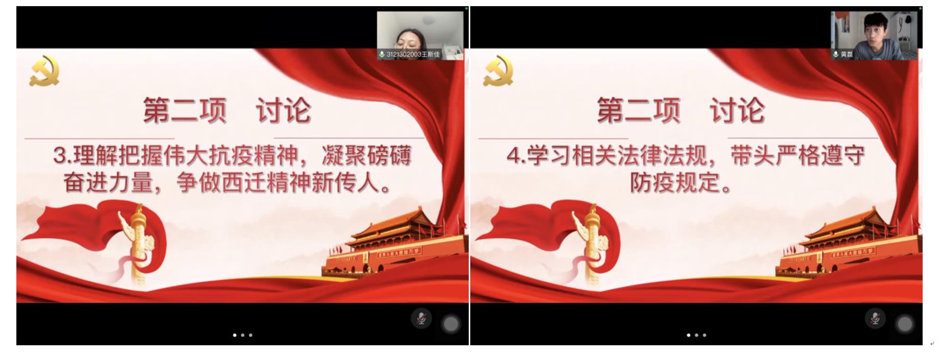 针对“理解把握伟大抗疫精神,凝聚磅礴奋进力量,争做西迁精神新传人”,王斯佳同志表示:我们身处西安,在需要时要贡献自己的力量,做好志愿服务,不为国家添乱,相信抗击疫情终将会取得胜利,做好自己分内的事;余秋衡表示:习近平总书记新年贺词中“人民”出现了八十余次,作为交大学子,我们要胸怀伟大抗疫精神和西迁精神,为周围同学做好抗疫榜样。