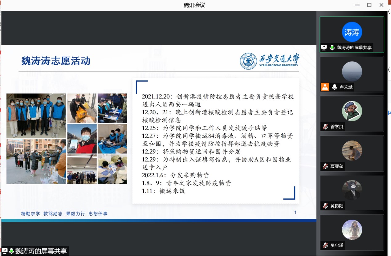 会上,同学们学习了抗疫精神和西迁精神的主要内容。此次西安疫情是武汉疫情之后最为严重的一次。封闭在宿舍的同学们为了为抗疫做出贡献,纷纷参加志愿活动。支部内的几位同学分享了自己做志愿者的事迹和感悟。魏涛涛同志作为一名学生党员,从疫情初期便积极响应学校和学院的号召,参与各项志愿服务,包括查验一码通、核酸检测、物资发放等,是同学们学习的榜样。这次志愿者活动,也是同学们切身感悟和亲身实践西迁精神的一次良好的机会。