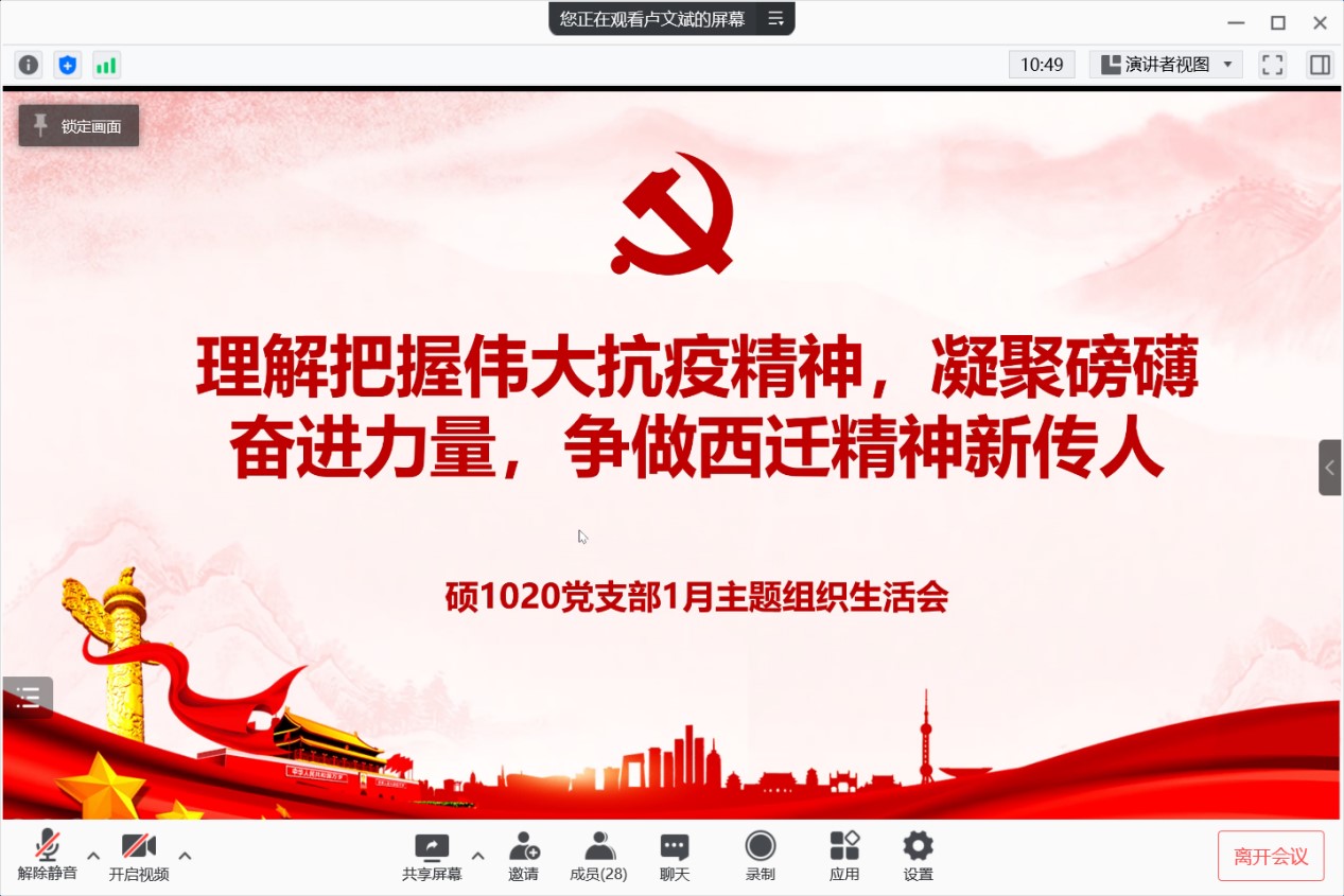 通过此次组织生活会,硕1020党支部加强了对党史的学习,深刻感悟到习近平总书记的人民情怀,理解把握伟大抗疫精神和西迁精神,认真学习《网络安全法》等法律法规等政策规定,共同提高法治素养,身体力行做疫情防控的参与者、防控知识的传播者、疫情谣言的制止者。我们相信有党中央的领导,这场疫情防控阻击战的胜利就在不远的将来,中华民族的伟大复兴就一定能实现。
