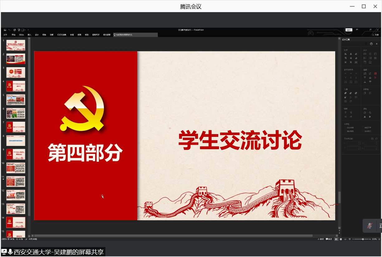 首先是吴建鹏同志为大家分享了这次会议的主题内容,并带大家重温了习近平总书记2022新年贺词。主要围绕学习新年贺词文本与视频,聚焦历史与未来,深刻领会党的百年奋斗重大成就和历史经验,牢记初心使命、传承红色基因,心怀“国之大者”,主动担当作为进行交流。