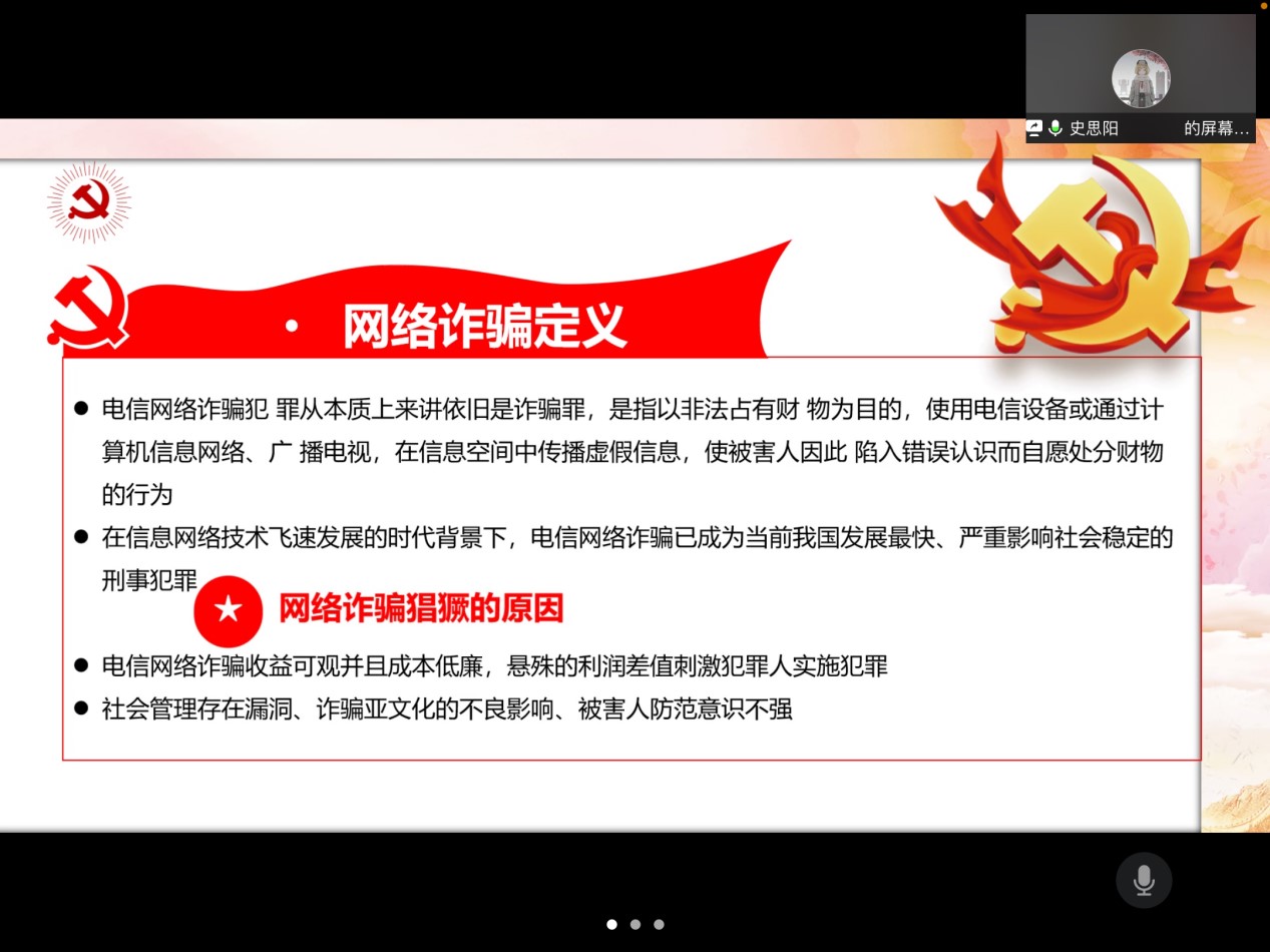 史思同志从我国电信网络诈骗的基本情况,诈骗者职业构成情况介绍了网络安全的背景。并且讲解了网络诈骗定义,并总结归纳网络诈骗猖獗的原因主要是电信网络诈骗收益可观并且成本低廉,悬殊的利润差值刺激犯罪人实施犯罪;社会管理存在漏洞、诈骗亚文化的不良影响、被害人防范意识不强。之后介绍了网络的正面特点,网络的负面特点,以及网络交易的特点,主要有广泛性、全面性、时效性、隐蔽性、风险性。作为高知分子,交大学子被骗的案例不在少数,对此我们一定要提高警惕,不要掉以轻心。