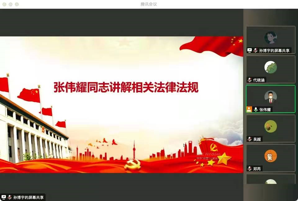 之后,支部书记张伟耀同志带领大家学习相关法律法规。他着重介绍了网络安全法的实施背景、意义和青年大学生应该如何践行;隐私权的定义、内涵、侵权行为和当前疫情条件下涉及隐私权的案例辨析;同时讲述了疫情期间学校、学院教职工们的付出与奉献。