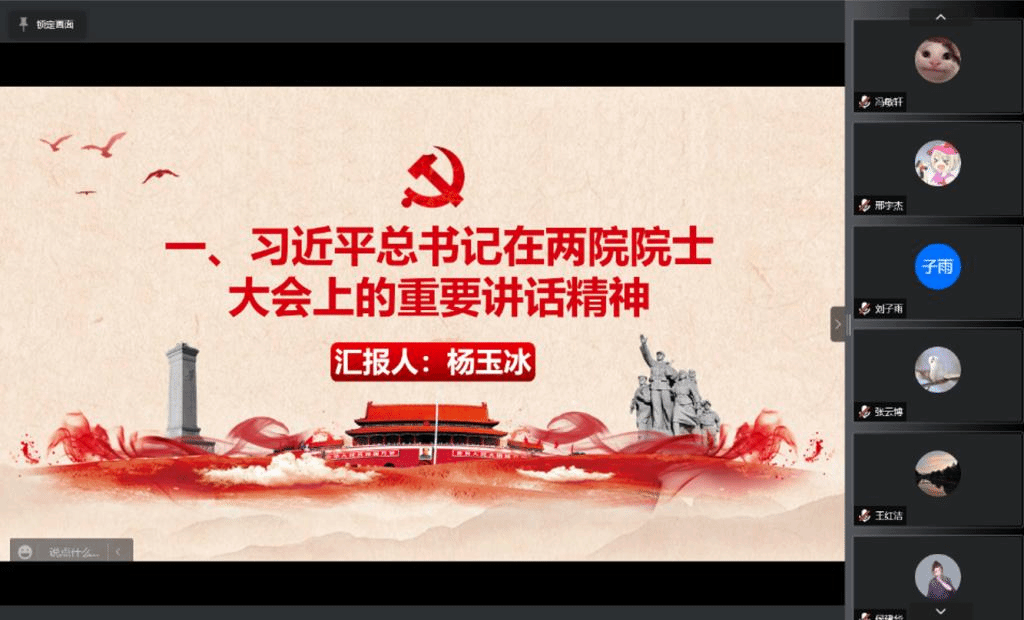 支部委员杨玉冰带领着大家进行本次专题学习,通过学习探讨,从而深入理解习近平总书记在两院院士大会上的重要讲话精神。支部委员杨玉冰从“科技创新取得新的历史性成就”、“构建创新型国家战略目标”、“总书记对院士的希望”等三个方面为大家详细讲解了习近平总书记在两院院士大会上的重要讲话。