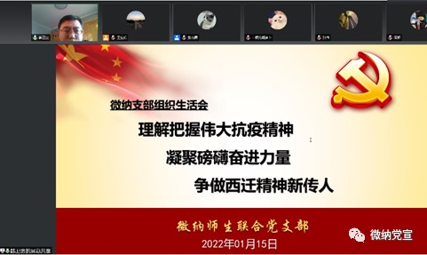 2021年12月底疫情席卷西安,支部充分发挥基层党组织的战斗堡垒作用,在隔离期间始终贯彻“抗疫不止隔离,知识才是武器”的指导方针,自12月至次年1月,连续在线上开展三次组织生活会,号召支部成员发挥模范先锋作用,积极投身抗疫工作,同时引导支部及微纳中心师生迅速调整生活与工作模式来适应疫情下的新形势,争取在疫情期间也能不负时光,有所收获。期间,微纳师生联合党支部共有7名成员参与到了志愿者服务工作中,参与人数占支部成员总人数的20%。