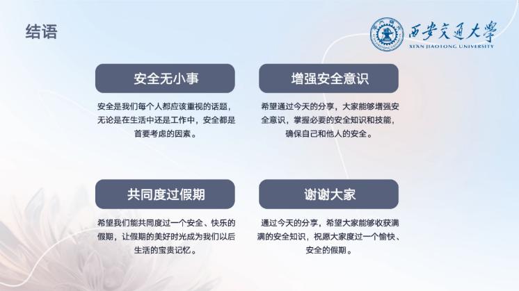文治彭康本科生师生联合党支部的赵丽娟同志为同志们开展了暑期安全意识培训。赵丽娟同志从网络安全、生活安全、实验室安全三个主要方面展开,详细阐述了安全的重要性。她强调,安全是每个人都应该时刻关注的重要议题,无论是在网络环境中保护个人信息,还是日常生活中的自我保护,抑或是在实验室工作时的规范操作,都是我们假期需要关注的地方。针对安全问题,赵丽娟提出了一些具体防范措施:如在网络上,应尽量使用复杂密码,保护个人信息安全;在生活中,保护好我们的人身安全,注意食品卫生等;在实验室里,应注意预防火灾和中毒,必须规范操作,正确使用器材,正确穿戴防护装备。赵丽娟同志提醒大家,安全无小事,每一个细节都可能是影响安全的关键。只有不断强化安全意识,掌握必要的预防知识和应急技能,才能更好地保障自身和他人的安全。最后,她祝各位同志们都能度过一个既安全又快乐的假期。