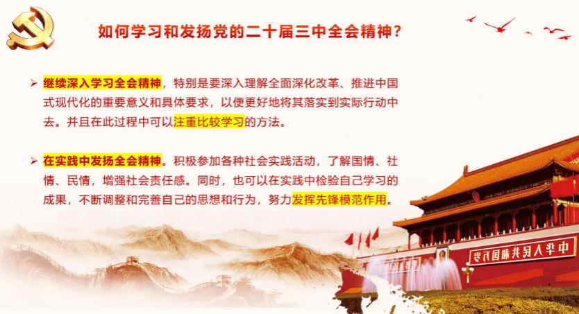会议伊始,人文学院崇实书院师生联合第一党支部的温馨同志和邓浩培同志从党的二十届三中全会的影响探讨改革的必要性。她们强调新时代青年需学习和发扬全会精神,不仅要理论上学习,也要实践行动。同时,她们寄望青年发挥模范作用,引领其他党员同志学习和贯彻全会精神,为国家发展做出贡献。