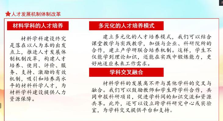 文治彭康本科生师生联合党支部的左霄冲同志引领同志们再次聚焦党的二十届三中全会的精神内涵。左霄冲同志的分享涵盖了教育、科技体制的深化改革,以及人才发展机制的全面革新。他着重强调,为适应新时代的步伐,现代高校教学理念需要更新,课程体系需优化。此外,需要构建更为高效、互动的学习环境。在师资队伍建设方面,左霄冲同志强调了实践教育的重要性。同时,他将党的二十届三中全会精神与材料学科的人才培养策略相融合,讲述了多元化人才培养模式的必要性和多学科交叉融合的战略意义,这种教育模式不仅能促进学科间的知识共享,还能激发学生从不同角度解决问题的能力。左霄冲同志还提到目前材料学科在高速发展的时代,需要在教育、科技、人才这些领域实行改革以达到发展新质生产力的目的,从而更好地适应时代的需求。