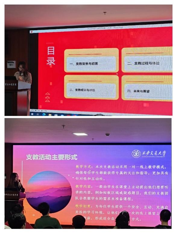 随后,人文学院崇实书院师生联合第一党支部的徐文琪同志和电气学院南洋书院师生联合第一党支部的孙雯蕾同志分别对其支部的支教活动进行了心得分享。徐文琪同志重点分享了促进民族教育公平的重要性,以及党中央对发展民族教育的重视,并详述了支教过程、学生们的进步与变化及对未来支教的建议。孙雯蕾同志则介绍了在汶川水磨中学开展的云端支教活动,阐述了团队如何通过一对一的线上教学模式,进行定制化教学和交流互动来提升教学效果,克服支教过程中面临的诸多挑战,为学生们营造了安全、互动且富有启发性的的学习环境。