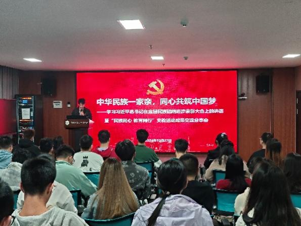 文治彭康本科生师生联合党支部书记侯嘉俊同志为本次会议作了总结发言,他对大家在支教过程中所付出的努力和取得的成绩给予了高度评价,并对各支部之间展现的协同合作与共赢精神表达了深切的赞赏,此外他特别强调了民族团结的重要性,号召党员同志们以铸牢中华民族共同体意识为主线,不断推进民族团结进步事业。