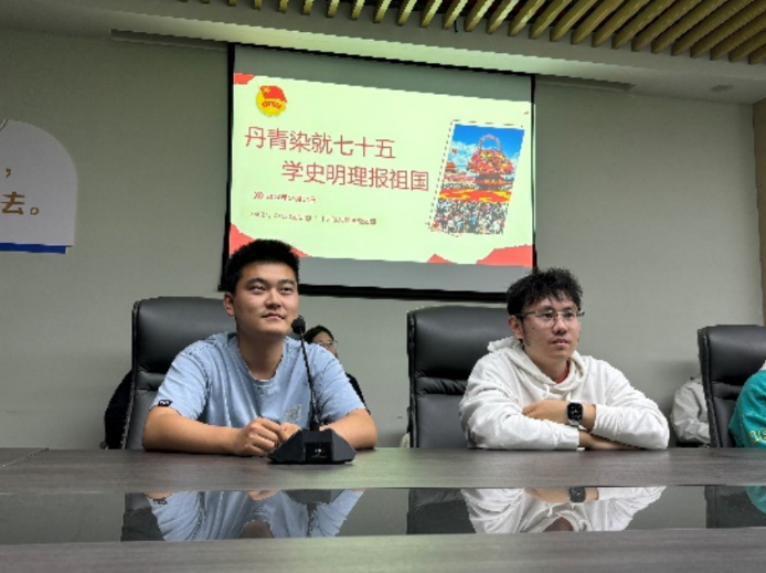 团日伊始,曹蕴祺同学以“丹青染就七十五,学史明理报祖国”为主题,带领大家学习习近平总书记在庆祝中华人民共和国成立75周年招待会上的讲话精神,随后,冯炳翰同学以“铭记党史,不忘初心”为主题,带领大家回顾中国共产党成立以来百年的艰难奋斗历程,传承红色基因,赓续红色血脉。