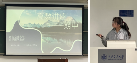 彭潞同学在讲座中首先从知识点清单引入了高等数学的主要考点,重点讲述了微分中值定理等内容,她介绍了几种常用的高阶导数求导公式并通过典型例题与往年考题的分析,帮助同学们巩固了许多重要知识点、考点。她重点讲述了求极限、函数间断点的分类、泰勒定理以及证明等常考考点的解题技巧,帮助同学们进一步了解高数期中考试,以考出更理想的成绩。