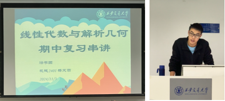 杨天雨同学针对线性代数与解析几何的前三章内容,从重要知识点回顾入手,带领同学们复习主要概念及性质,如矩阵的线形变换、向量的运算等。随后通过典型例题分析,给同学们详细介绍各种解题思路与解题方法,帮助同学们把握各知识点。最后他对往年考题进行分析讲解,帮助同学们更加深刻理解考题类型与考试内容。