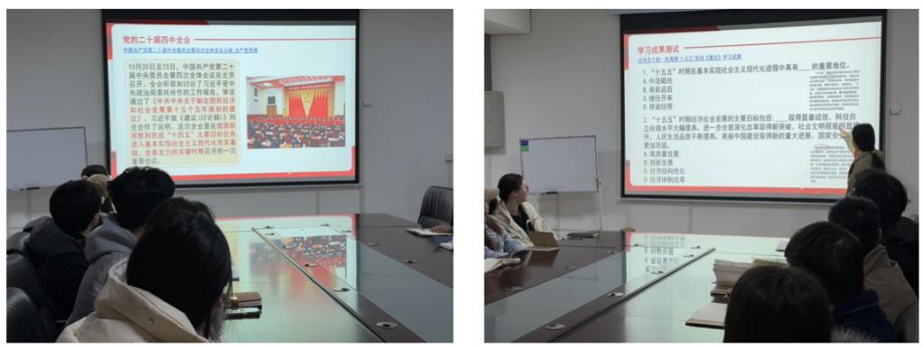 张依萍同志带领全体党员深入学习了《中共中央关于制定国民经济和社会发展第十五个五年规划的建议》,她系统梳理了“十五五”时期在我国社会主义现代化进程中的“承前启后”重要意义,鼓励大家立足专业、瞄准前沿,将个人科研方向与国家战略需求紧密结合,为实现高水平科技自立自强贡献力量。在学习成果测试环节,全体党员积极参与答题,进一步巩固了对“十五五”时期经济社会发展主要目标的理解。
