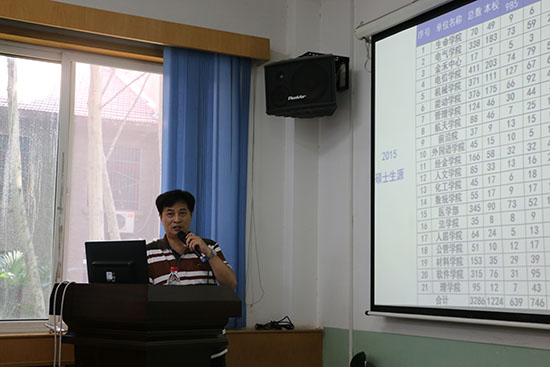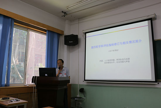 教职工介绍了新一轮学科评估的相关情况,从人才培养质量、科学研究水平、社会贡献与声誉和师资队伍四个方面讲述了新一轮学科评估标准的变化及学院今后的努力方向。之后他又对本次学院教师岗位聘任的情况进行了讲解,提出教师在承担教学与科研任务的同时,还应承担一定的学校和学院服务工作。