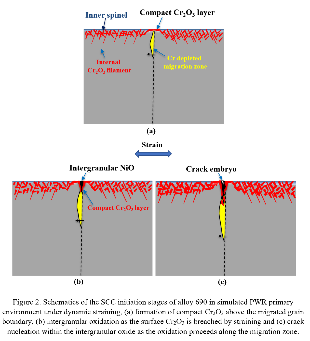 在另一项工作中,研究人员采用慢应变速率拉伸的方法研究了压水堆电站中传热管材镍基690合金的应力腐蚀裂纹起始过程。690合金自80年代投入使用以来电站现场还未出现开裂报道,其长期服役的可靠性仍备受关注。研究人员发现在动态加载下该材料也会发生应力腐蚀裂纹起始。其起始过程主要分为三个阶段:1、铬沿晶界扩散至表面发生氧化晶界,晶界发生迁移;2、表面氧化膜在动态应变作用下发生破裂,氧向晶界或晶界迁移区扩散导致择优氧化;3、晶间择优氧化导致晶界强度降低,裂纹逐渐在氧化物内萌生。这项工作第一次系统地解析了690合金应力腐蚀裂纹萌生的整个过程,为今后建立该合金的寿命预测模型奠定了基础。