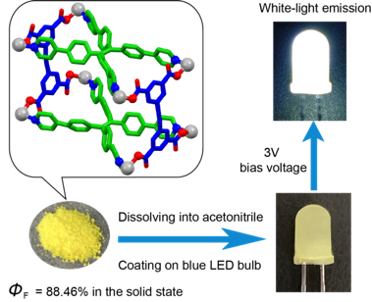 的张明明教授课题组通过将聚集诱导发光与配位诱导发光结合的策略,以四苯基乙烯衍生物作为结构单元,通过与金属铂(II)及羧酸钠配体的自组装制备了一系列多组分发光金属笼状配合物(MEMs),并通过单晶结构证实了其笼状结构,结合计算揭示了其主客体化学性质弱的原因。该类金属笼不仅在溶液态具有良好的发光能力,在固态时会发出黄光,其绝对荧光量子产率高达88.46%。由于其合适的发射颜色、高的固态荧光量子产率和良好的溶液加工性能,可利用其作为蓝光LED的涂层来制备白光发光二极管。本研究不仅为金属笼状配合物的构建提供了一种通用的策略,而且还利用其作为涂层构筑了白光发光二极管,拓展了金属笼状配合物作为固态荧光材料的应用。