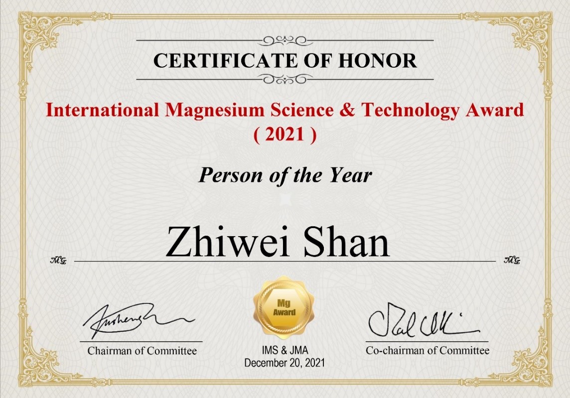 单智伟教授荣获“年度人物奖(Person of the Year)”,以表彰其在金属镁的高纯化及塑性变形领域的原创性贡献。在过去的7年中,单智伟教授团队致力于开发低成本、大规模金属镁纯化新技术,发现金属镁塑性差并非领域内此前所普遍认为的因素所造成的,而是另有原因(Liu,Shan et al., Science, 2019);在实验室实现了百克级5N+(>99.999%)超高纯镁的稳定制备;在中试工厂实现了30公斤级的4N5高纯镁生产;并正在原镁企业建设一条千吨级3N5A高品质原镁生产示范线。团队立志带动更多国内镁产品上游企业提质升级,为中国乃至世界金属镁产业提供优质的绿色原材料镁。同期荣获本年度人物奖的还有德国Helmholtz-Zentrum Hereon镁中心前主任Norbert Hort教授和上海交通大学曾小勤教授。