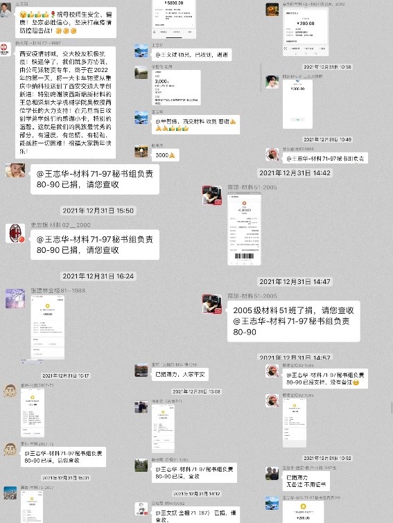 12月31日,材料学科校友会发出号召校友积极参加抗疫攻坚战的倡议书后,校友们积极响应,同心抗疫,3天捐赠善款5万元,该部分资金将全部用于支持学院开展一线疫情防控相关工作。在疫情防控的关键时刻,校友们的爱心之举和温暖问候极大地鼓舞了在校师生团结一致、打赢疫情防控战的信心与决心,诠释了广大校友与母校同心协力、共克时艰的责任与担当。