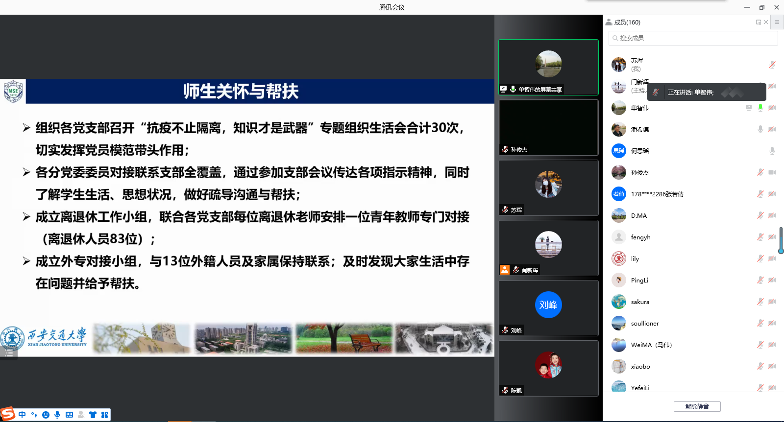 院长单智伟通报了学院在疫情期间,学院围绕科研教学、学生管理、安全保障等方面采取了系列有效措施,做到战“疫”、工作两不误。其中成立院长和书记牵头的疫情专班,每晚定时期汇报当日工作进展,开会研讨当日工作进展,结合发现问题及时采取针对性措施;及时发布给各系室主任和支部书记会议纪要和工作简报,互通信息,做好机制保障;建立一支院领导为首、学生骨干为核心的工作队伍,对全体研究生实行网格化管理;班主任们开创了“云自习”模式,督促学生复习,做好学业帮扶;依托“周惠久论坛平台”,打造系列高端学术活动,丰富师生学术生活;人员及各系室负责人微信群,规范巡检信息反馈流程,时刻掌握实验室情况,做好实验室安全管理工作等。他还讲到除了全体教职工凝心聚力、共克时艰之外,材料学科校友会及社会爱心人士校友们、兄弟院校、企事业单位等也纷纷捐赠各类所需物资,送上暖暖的关心与问候,共同筑牢疫情防控堡垒,一起守得云开见月明。