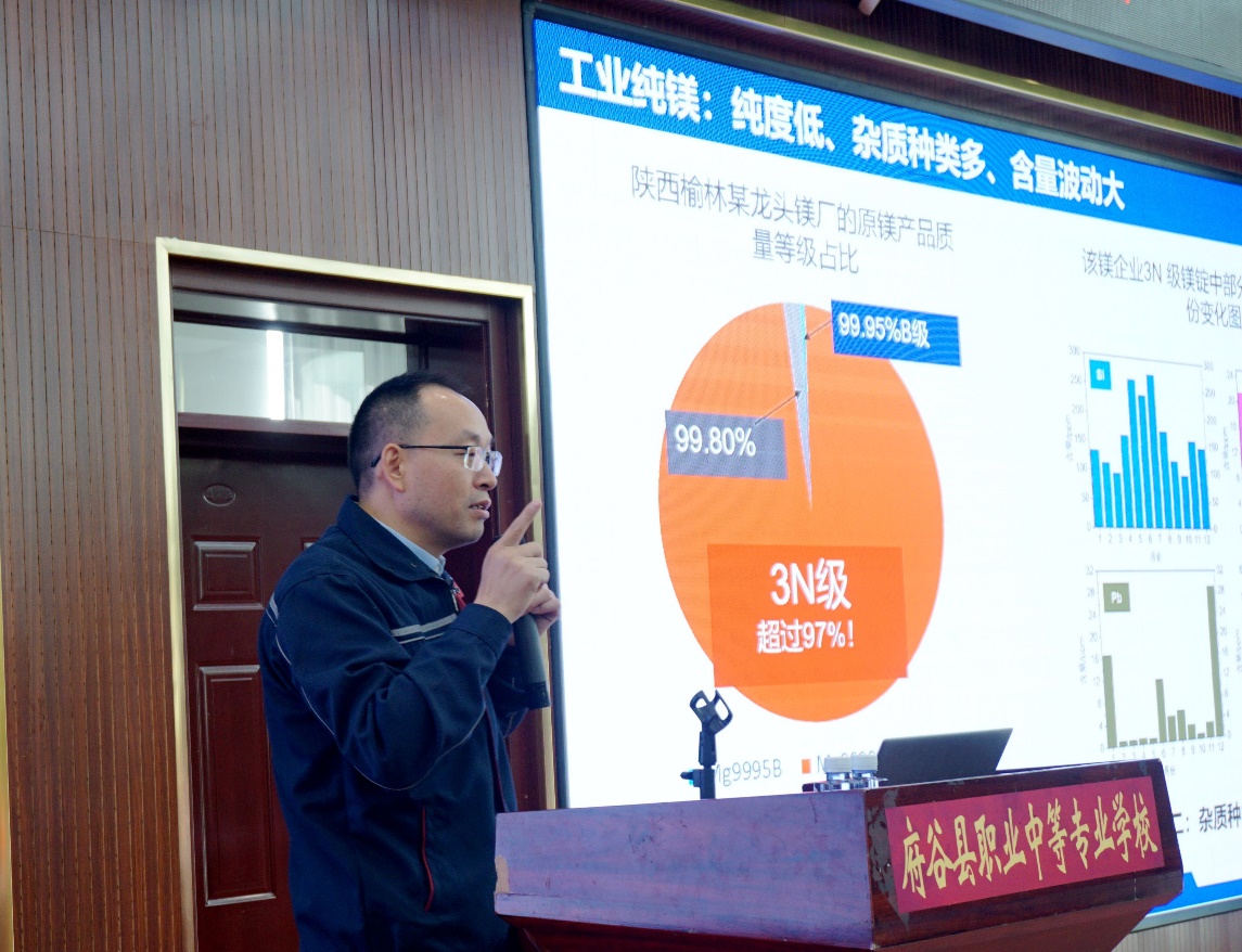 府谷县职业中等专业学校校长陈治平介绍金属镁实验实训基地概况。2021年,府谷职业中专煤化工专业定位为金属镁方向,开设两个专业班,招收新生100人,并与牵手