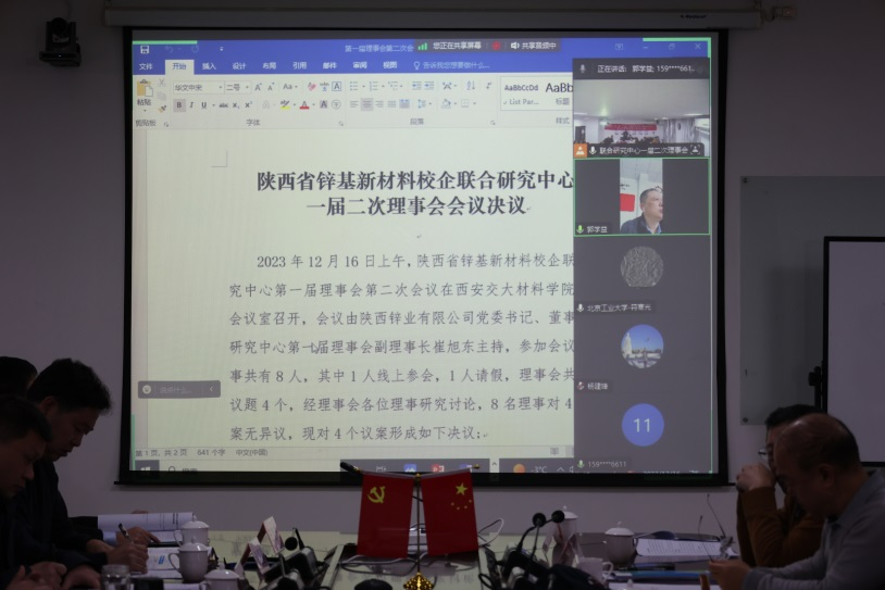 2023年12月16日上午,陕西省“四主体一联合”锌基新材料校企联合研究中心(以下简称:研究中心)一届二次理事会暨技术委员会在牵手