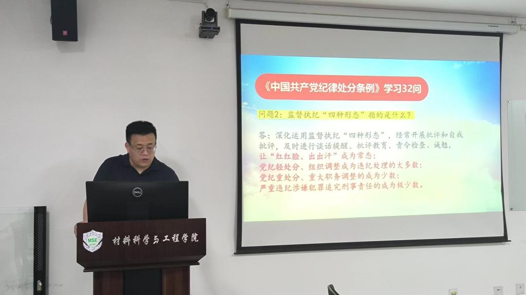 新材料室主任史忠旗在交流中指出,《条例》的多次修订体现了我党与时俱进、不断推进自我革命的精神,作为党员必须在日常工作生活中更加深入系统地学习,明晰党的纪律规矩,将纪律意识外化于行,把学习成果转化为推动工作的实际成效。热喷涂师生联合党支部书记雒晓涛结合党支部工作实际分享了自身的学习感悟,基层党支部要做好学生党建工作,组织学生党员以高度的政治自觉、饱满的学习热情和严肃的政治态度投入为人民服务的事业之中。