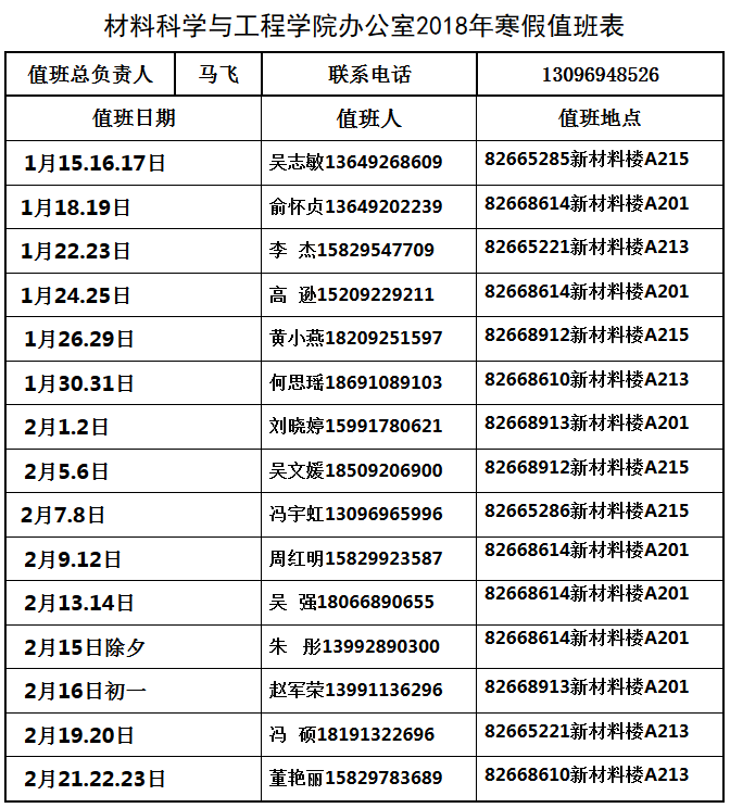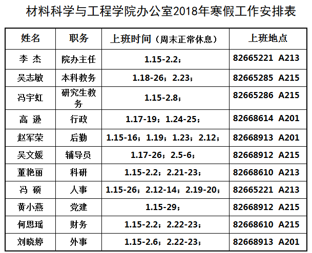 为了保证寒假期间的工作运行,学院办公室寒假期间值班安排如附件1;另其他业务类工作安排如附件2,请阅知。