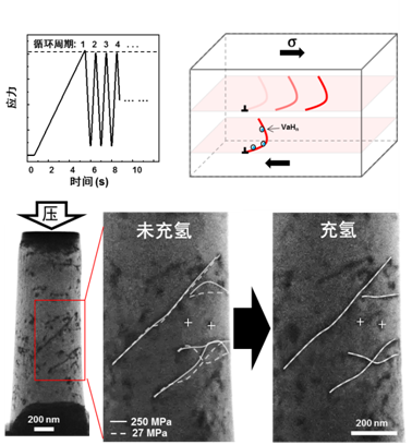 图:循环应力作用下,金属铝中的位错在充氢之后运动停止。