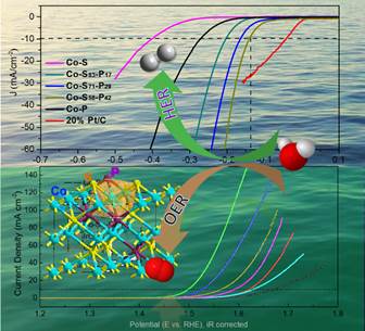 表面工程研究室戴正飞特聘研究员与新加坡南洋理工大学的颜清宇教授合作,设计开发了一种高效稳定全电解水催化剂——非化学计量比的六方相磁黄铁矿型单磷硫化钴黄壳(yolk-shell)结构,通过调节硫化/磷化程度,获得了具有不同硫磷原子比的单磷硫化钴,可有效调控Co3+/Co2+的比例及材料的电子结构,其中,P2-和Co3+离子分别表现高的电子给予和受予能力,可分别有效地促进析氢/析氧反应(HER / OER)。Co0.9S0.58P0.42展示了较低的析氧反应过电位(266 mV,电流密度10 mA·cm-2)和较小的塔菲尔斜率(48 mV·dec–1),对于对称的全电解水反应,当电流密度为10 mA·cm-2时,仅需1.59 V的工作电位。相关研究成果以“Hexagonal-Phase Cobalt Monophosphosulfide for Highly Efficient Overall Water Splitting”为题,发表于材料科学领域著名期刊ACS Nano(IF=13.942)上。戴正飞研究员为论文的第一作者,牵手