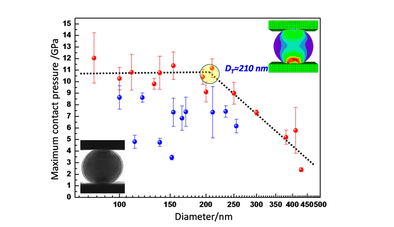 金属材料的理想剪切强度是指完美晶体在发生塑性变形前所能承受的最大剪切应力,其理论估算值为G/2p,G是金属的剪切模量。然而,由于晶格缺陷的存在(位错和点缺陷),实际金属材料的屈服强度通常比理想剪切强度要小2~3个数量级。近年来,世界各国科学家对微纳尺度样品的强度尺寸效应进行了系统的研究,发现随着样品尺寸的减小,金属材料的强度会越来越高,即“越小越强”效应。但是,截止目前,仅有纳米压入实验能够测到接近或超过理论强度的应力,而且由于纳米压入实验的应力条件非常复杂,其结论存在争议。微纳中心的研究者调研发现,球形样品可以有效防止常规方形或圆柱状样品接触面因常见的非完美接触而产生的应力集中问题,从而能有效避免小尺度样品因局部变形而导致的过早屈服;另外,在压应力作用下,球形样品的最大应力位于样品内部而非表面,因此可以有效抑制由于样品表面缺陷成核而导致的塑性屈服。基于上述考虑,研究人员选取用特殊方法制备的微纳尺度的球形纯铁颗粒作为研究对象,并对其进行的原位定量的研究。结果发现,纳米铁球的屈服强度尺寸效应展现出两阶段特征:1. 随着球形颗粒直径减小,接触强度展现出常规的越小越强趋势;2. 当纳米铁球小于临界尺寸(~210 nm)时,接触强度达到一个应力平台区,即纳米铁球强度与尺寸没有依赖关系(见下图)。相应的理论计算表明,具有最大接触强度的纳米铁球内部的剪切屈服强度达到~9.4 GPa, 与第一原理和Frenkel模型预测的纯铁理想剪切强度一致。