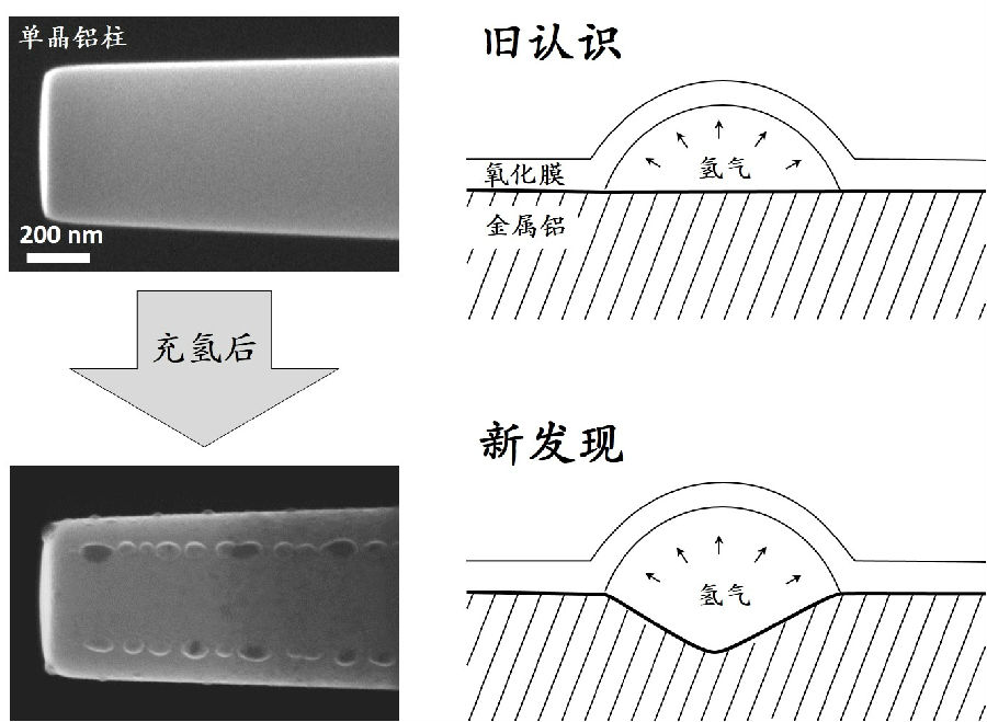 氢脆的机理是一个有着上百年历史的科学问题。传统的理论认为氢致金属表面起泡的原因是氢气在界面上聚集所产生的压力使得表层材料鼓起形成的,而基底的金属材料会保持原有形状。但是,基于上述认知的理论尽管可以解释氢泡的生长但却无法解释氢泡的成核,因为根据该理论氢泡的成核应力将远远超过金属基底的屈服强度,从而使其发生塑性变形,而这与传统的认知和假设相悖。因此,氢泡的起源一定有尚未被揭示的机理在起作用,而界面的动态演化将是解密的关键。基于上述认知, 牵手