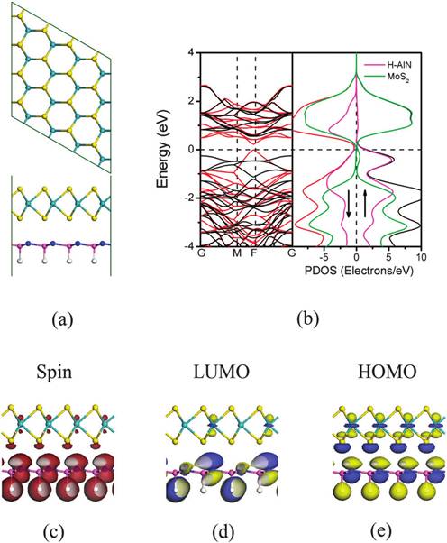 二硫化钼(MOS2),具有六方晶系晶体结构,由S-Mo-S的单层结构构成。这种独特的结构赋予了二硫化钼许多优良的热,电,光学,机械性质,同时还提供了足够的间层空间来嵌入外来分子和原子。因此它很有可能成为性能优异的逻辑器件。基于此,何成老师开展了本项研究。在本研究中,利用范德华力修正的密度泛函理论对氮化铝纳米片晶上单层二硫化钼的可调谐电子和磁性能进行了系统的研究。结果表明,AlN基板的表面微观结构和堆叠模式显著影响异质结构的电子和磁性能。此外,对单层的MoS2可以实现n型半导体到p型半导体的金属过渡且伴随有非磁性到磁性的转移。该项研究表明有效地控制加氢位置和叠加样式是一种有效改变单层二硫化钼的性质的方法。研究的结果为设计新型纳米自旋电子器件奠定了基础。