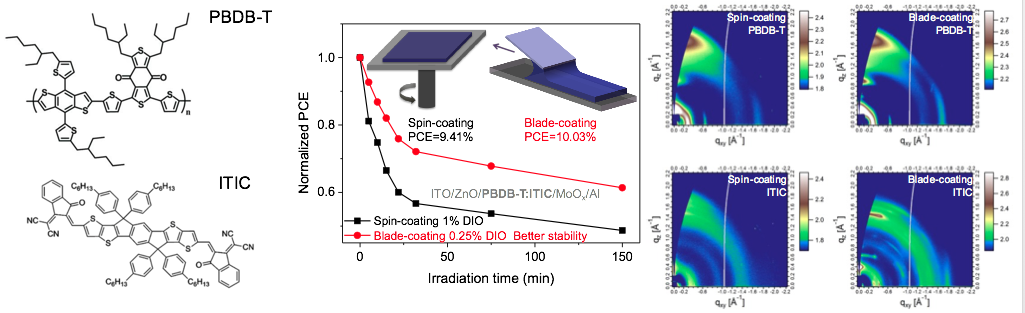 近年来,非富勒烯有机太阳能电池得到了快速发展,基于非富勒烯作为受体的电池效率取得了很大的进步。尽管如此,这些成绩都是在实验室基于小面积旋涂成膜(spin-coating)而获得的。为了今后的广泛应用有机太阳能电池,发展大面积加工技术极为迫切。狭缝挤出成膜是一种可结合卷对卷的连续大面积加工技术,是未来大面积加工有机太阳能电池的成膜技术。而刮涂成膜(blade-coating)是狭缝挤出成膜的一种原型工具,具有类似的特征。事实上,有机太阳能电池的活性层形貌对光电转化过程非常重要。相对于旋涂加工,刮涂法将对分子链施加更强的剪切力,改变分子排列及聚集状态。然而,在有机太阳能电池中利用强剪切力来优化强结晶性的活性层形貌相关研究还没有报道。此外,在优化形貌过程中常用到的高沸点添加剂难以去除,这影响器件的稳定性,因此在器件的制备过程中要尽量减少高沸点添加剂的使用。