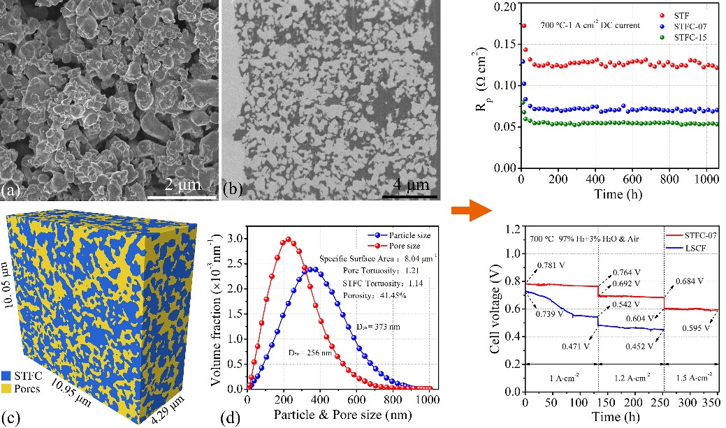 金属材料强度国家重点实验室李长久教授团队与美国西北大学Scott A. Barnett 教授团队进行合作研究,开发了一类新型SOC氧电极材料:Sr(Ti0.3Fe0.7-xCox)O3-δ (STFC),该氧电极材料不仅具有良好的电化学催化活性,而且具有优异的稳定性。在该工作中,研究人员通过B位Co掺杂改善Sr(Ti0.3Fe0.7)O3-δ 的性能,对该类材料的基本物理性能进行了系统的研究。通过FIB-SEM技术对多孔电极的微观结构进行了三维重组分析,并结合电化学性能及ICP测试技术研究了该类材料表面成分偏析现象;同时对电极材料的长期稳定性进行了深入研究。研究发现,少量Co掺杂,不仅可增加材料的电导率及氧空位浓度,同时可显著降低电极表面Sr的偏析,改善电极的氧表面交换系数及氧扩散系数,从而显著提升电极的催化性能,且电极的稳定性则不受任何影响。而且通过在700 °C,电流密度为1 A/cm2下的长期运行考核测试,发现由该氧电极构筑的SOC无论工作在燃料电池还是电解池模式下,STFC氧电极均表现出优异的长期稳定性。此外,STFC氧电极材料仅含Sr、Fe、Ti及少量的Co,不含任何稀土元素,其成本远远低于当前其他氧电极材料。该项工作对SOC高性能氧电极材料的开发与设计以及推动SOC的商业化应用具有重要意义。