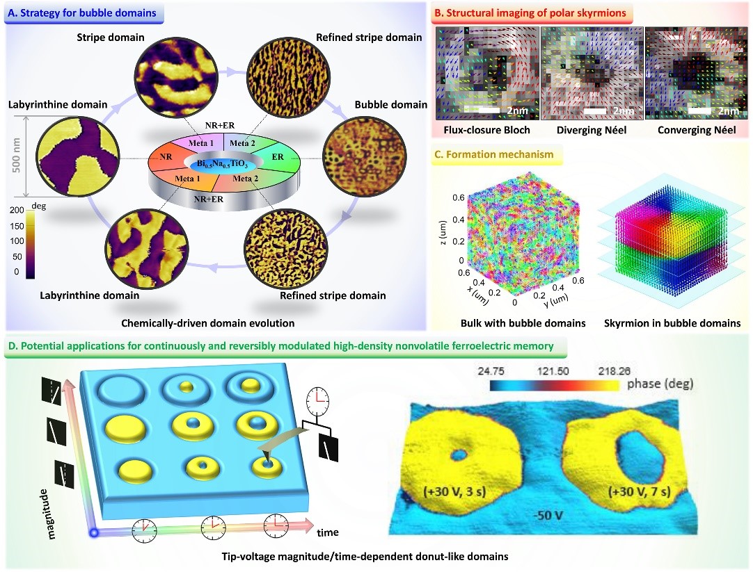 图例:A. 在钛酸铋钠基弛豫铁电陶瓷中通过化学改性来诱发泡状畴的策略。B. 用球差校正的STEM对潜在的极性斯格明子进行实空间成像。C. 相场模拟的结果揭示块体铁电材料中的多种极性结构。D. 泡状畴在外加电场作用下演变为“甜甜圈”状电畴结构,在高密度存储方向可能具有潜在的应用价值。