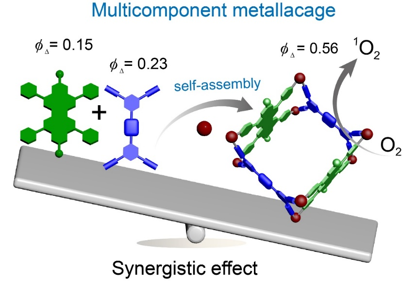 的张明明教授课题组通过配位自组装将两种常见的光敏剂(苝酰亚胺和苯并噻唑)结合在一起,制备了一类桶状多组分金属笼。这种策略不仅通过带电荷的笼状结构之间排斥作用避免了其自聚集,而且还利用铂基配位键促进了系间窜越,提高了其单线态氧产生能力(单线态氧量子产率高达56%)。这些笼状化合物可以将一些烯类衍生物包裹进空腔内,通过可见光照产生的单线态氧将其氧化,表现出了优异的催化效率(产率>90%)、良好的光稳定性和可重复使用性。该项研究不仅提供了一种通过配位自组装构筑具有优异单线态氧产生能力的金属笼的策略,还拓展了其在光催化氧化反应领域的应用,为金属笼在光催化方面的设计和应用提供了指导。