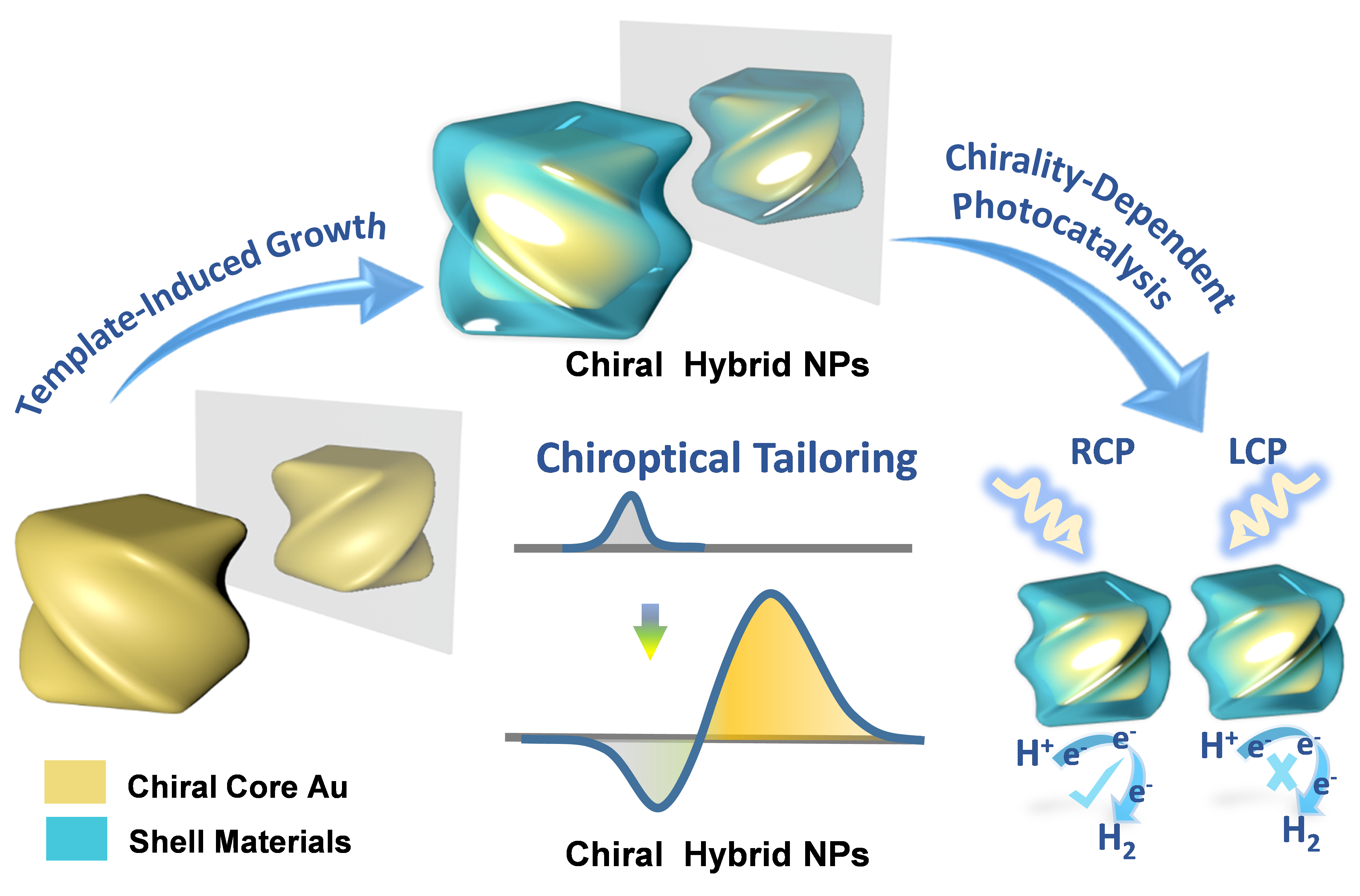、金属材料强度国家重点实验室和陕西省软物质国际联合研究中心的研究人员提出了手性结构(shape chirality)诱导的设计思路,发展了一种构筑手性等离子体金属-半导体异质纳米结构的普适性策略,成功构筑了一类新型手性异质贵金属-半导体纳米结构(手性Au@X;X为Ag2S、CdS、ZnS、TiO2等半导体纳米材料),实现了手性光学信号的放大和调控,并首次报道了手性无机异质纳米材料具有显著的手性依赖光分解水制氢性能。研究人员首先根据贵金属纳米粒子结构稳定性高的特性,在制备手性形状的贵金属纳米结构的基础上,以其作为手性诱导模板,在其表面生长功能性壳层材料,一方面通过材料参数的独立控制,如核几何形状、壳层厚度以及体系的手性,实现纳米结构手性等离子体核和半导体介电壳层之间的强手性耦合;另外通过改变壳层材料的种类,引入期望的功能性,极大扩展了手性纳米材料的功能性。实验及理论建模计算研究表明,手性无机异质纳米结构的核壳强耦合效应不仅使材料获得增强的且精确可调节的手性光学活性,同时也赋予异质材料新的手性光学性质。