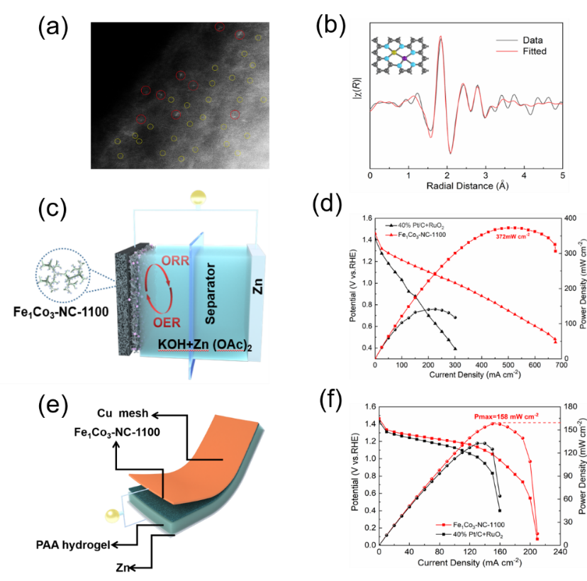 (a)球差电镜扫描透射图(红色圆圈标记为双原子位点,黄色圆圈标记为单原子位点)。(b)EXAFS光谱拟合曲线与FeCo-N6活性位点模型。(c,d)水系锌空气电池结构示意图和电池性能曲线。(e,f)柔性锌空气电池结构示意图和电池性能曲线。