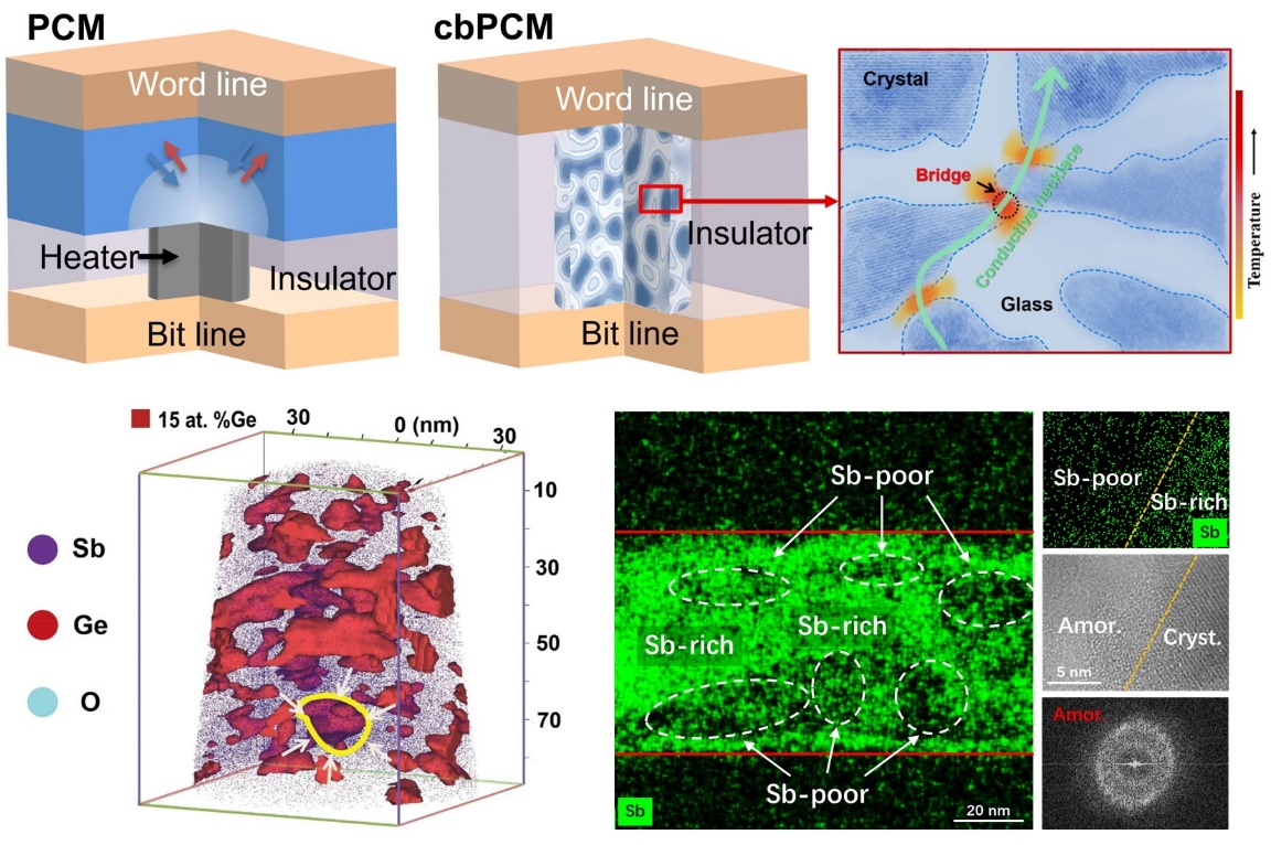 材料创新设计中心(CAID)研发了一种“导电桥”相变存储器,即设计了新型相变材料锗-锑-氧合金,利用材料的自发分相在存储器件的相变介质层中形成由高阻态非晶网络包围多个低阻态纳米“晶体岛”的异质网络结构。在存储器的操作过程中,异质网络结构基本保持不变,仅通过链接或断开“晶体岛”之间数纳米尺寸的“导电桥”即可实现数据的写入和擦除,极大地减少了相变存储器件的有效相变体积,将数百纳米制程相变存储单元的擦写功耗降低至0.05 pJ,与主流产品的功耗相比降低了一千倍,打破了存储器编程过程中功耗与电极/相变介质层接触面积之间成正比的比例关系。“导电桥”相变存储器也保证了较好的一致性和使用寿命。