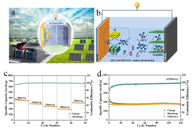 图 1. a-b) 镍-石墨熔盐电池的应用场景及其工作原理;