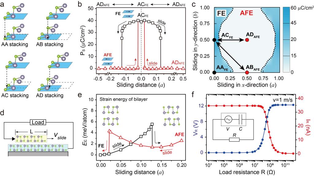 强度室的邓俊楷教授同澳大利亚墨尔本大学Zhe Liu副教授合作研究,通过第一性原理计算,在具有皱褶结构的双层IV-VI族二维材料MX(M=Ge, Sn; X=S, Se)中,发现了层间滑移诱发的面内可逆铁电-反铁电相变现象。深入分析发现,通常看似较弱的层间范德华力可以引起MX面内晶格发生畸变,在层间滑移过程中导致上层MX的面内共价键发生重构,诱发极化方向翻转,从而实现铁电和反铁电之间的相互转变。此外,基于该物理现象,提出了利用层间滑移诱发铁电-反铁电相变的纳米发电机模型。由于滑移过程中,能够产生高达40μC/cm2的铁电极化变化,同时借助二维范德华材料的超润滑特性,理论上可以产生巨大的电信号输出。计算表明其理论输出功率高于二维压电材料约四个数量级,表明了IV-VI族二维层状材料在纳米尺度的力电能量转换器件方面具有巨大的潜力。