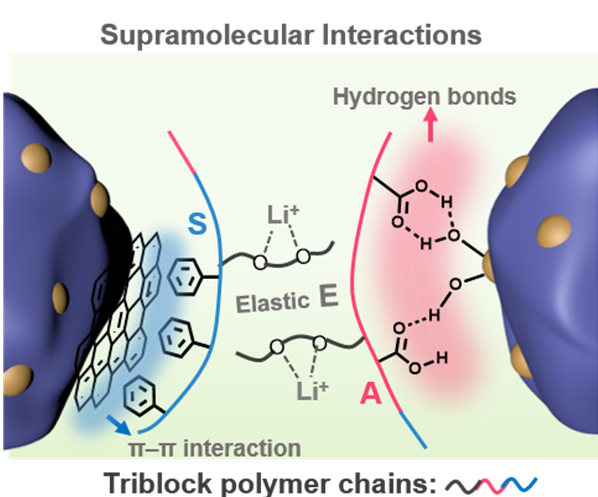 此外,课题组针对锂离子电池新一代高比容硅碳负极开发了一种界面适应型粘合剂解决因其大体积形变导致的容量快速衰减难题。所开发的三嵌段聚合物粘合剂PSEA由疏水的聚苯乙烯嵌段(S)、弹性的聚(2-(2-甲氧基乙氧基)乙酯(E)嵌段和亲水的刚性聚丙烯酸嵌段组成。与传统的硅基负极粘合剂不同,新型界面适应型粘合剂能够通过π∙∙∙π堆叠和氢键相互作用与C层和Si层结合,有效地促进界面粘附以及电极各组分在浆料中的均匀分散,进而维持电极组颗粒间的连接和电极的完整性。此外,粘合剂中柔性的聚醚侧链及其丰富的配位位点还可以促进聚合物链中锂盐的解离,加速Li+传输。得益于此,即使高面容量下,所制备的硅碳负极仍表现出优异的电化学循环性能。相关工作以《基于超分子相互作用的界面自适应粘合剂在锂离子电池高比容硅碳负极中的应用》(Interface-Adaptive Binder Enabled by Supramolecular Interactions for High-Capacity Si/C Composite Anodes in Lithium-Ion Batteries)为题发表在国际知名期刊《先进功能材料》(Advanced Functional Materials)上, 牵手