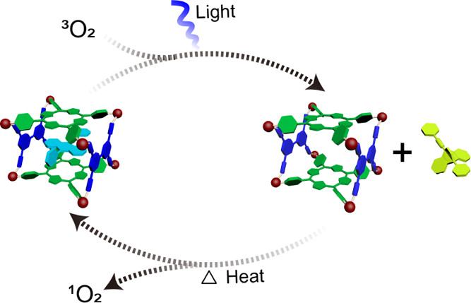 的张明明课题组利用四羧酸联苯与四吡啶卟啉作为构筑基元,通过Pt基配体的连接构筑了桶状的卟啉基金属有机笼。这种多齿配体的螯合配位利用金属配位键的协同性大大提高了其结构的稳定性,为其功能的研究与拓展奠定了基础。值得指出的是,在该结构中两个卟啉分子之间的距离为8.0 Å,有利于通过π -π堆积作用来有效地识别多环芳烃类分子。当蒽的衍生物作为客体分子时,该金属有机笼在光照下可以有效地产生单线态氧用以氧化其内部包裹的客体分子,进而破坏蒽衍生物的平面结构,使得其主客体结合能力大大下降,从而在金属笼的空腔里被释放出来。进一步加热该体系会使得氧化的客体分子释放出单线态氧回到其初始状态,进而被重新包裹到金属笼的空腔内。这种通过光氧化驱动的客体的可逆封装与释放过程有望被用于构建新型的刺激响应性材料。