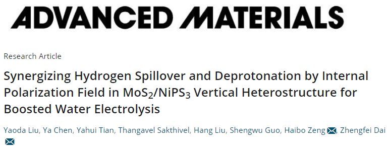 该研究成果以《MoS2/NiPS3垂直异质结构中内建极化场协同氢溢流和去质子化促进水电解》(Synergizing Hydrogen Spillover and Deprotonation by Internal Polarization Field in MoS2/NiPS3Vertical Heterostructure for Boosted Water Electrolysis)为题发表在《先进材料》(Advanced Materials上)。牵手