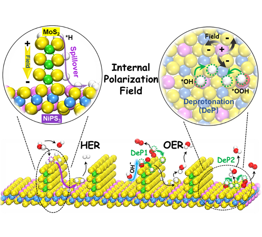 戴正飞特聘研究员与南京理工大学曾海波教授针对上述问题开展合作研究,设计并构建了一种全过渡金属基MoS2/NiPS3垂直异质结构,以协同加强HER氢溢流和OER去质子化过程,实现高效的全分解水。内建极化场(Internal Polarization Field, IPF)被认为是氢溢流和去质子化的驱动力。从MoS2边缘到NiPS3的氢溢流同时激活了NiPS3基面,从而提高了异质结构的HER活性(112 mV vs. RHE,10 mA cm–2)。对于OER,异质结构中的内建极化场IPF可以促进羟基扩散并形成MoS2-to-NiPS3和NiPS3基面上P-to-S的双去质子化通道,提升性能。将异质结构用作电极对,在施加1.64 V的电压时即可达到10 mA cm–2的电流密度,并稳定运行100 h。同时,该催化剂具有接近理论水平的全解水法拉第效率(~99%)。本研究提出以内建极化场作为合理设计氢溢出/去质子化统一的非贵金属电解水催化剂的标准,为催化剂的双功能化提供思路。